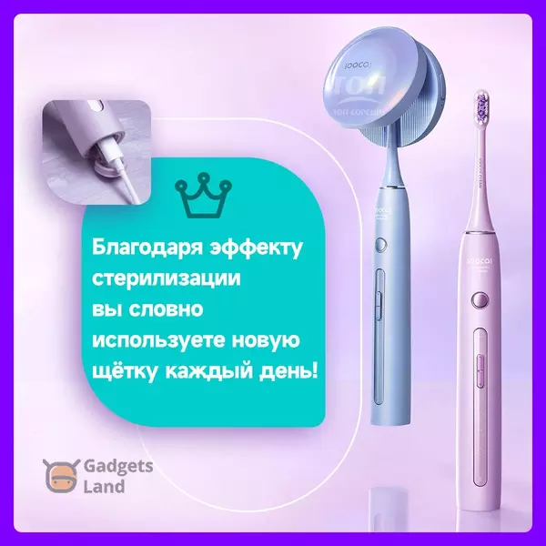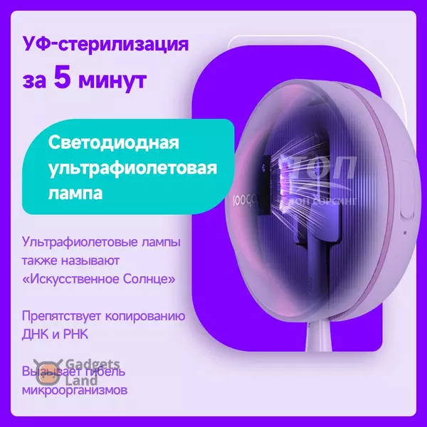 Комплектация: Зубная щетка, Комплект насадок, Футляр c функцией UVC стерилизации, кабель для USB, Техническая документация Особенности: индикатор зарядки